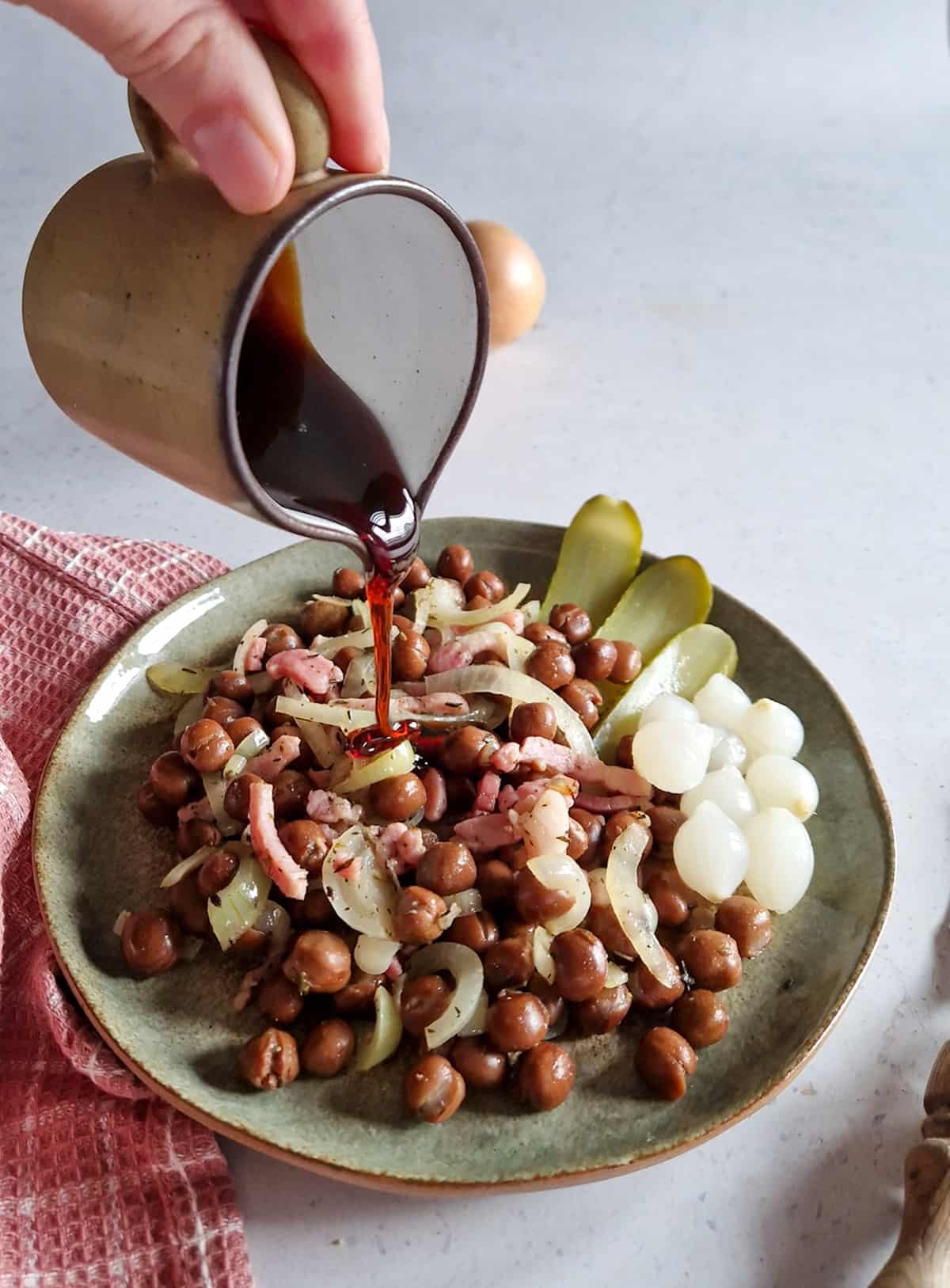 Ik ben dol op ouderwetse recepten! Zo kun je o.a. recepten voor grootmoeders hachee, ouderwetse gehaktballen, en een klassiek boerenjongens en boerenmeisjes recept op mijn blog vinden. Dit kapucijners recept is de nieuwste toevoeging. Ik at dit voor het eerst bij een vriendinnetje thuis, ik kan me niet herinneren dat we dit vaak thuis aten. Maar wat is het lekker! De romige kapucijners, zoute spek, zoete stroop en het zuur van de augurk en de Amsterdamse uien. Een bijzonder eenvoudige maaltijd, maar overheerlijk.